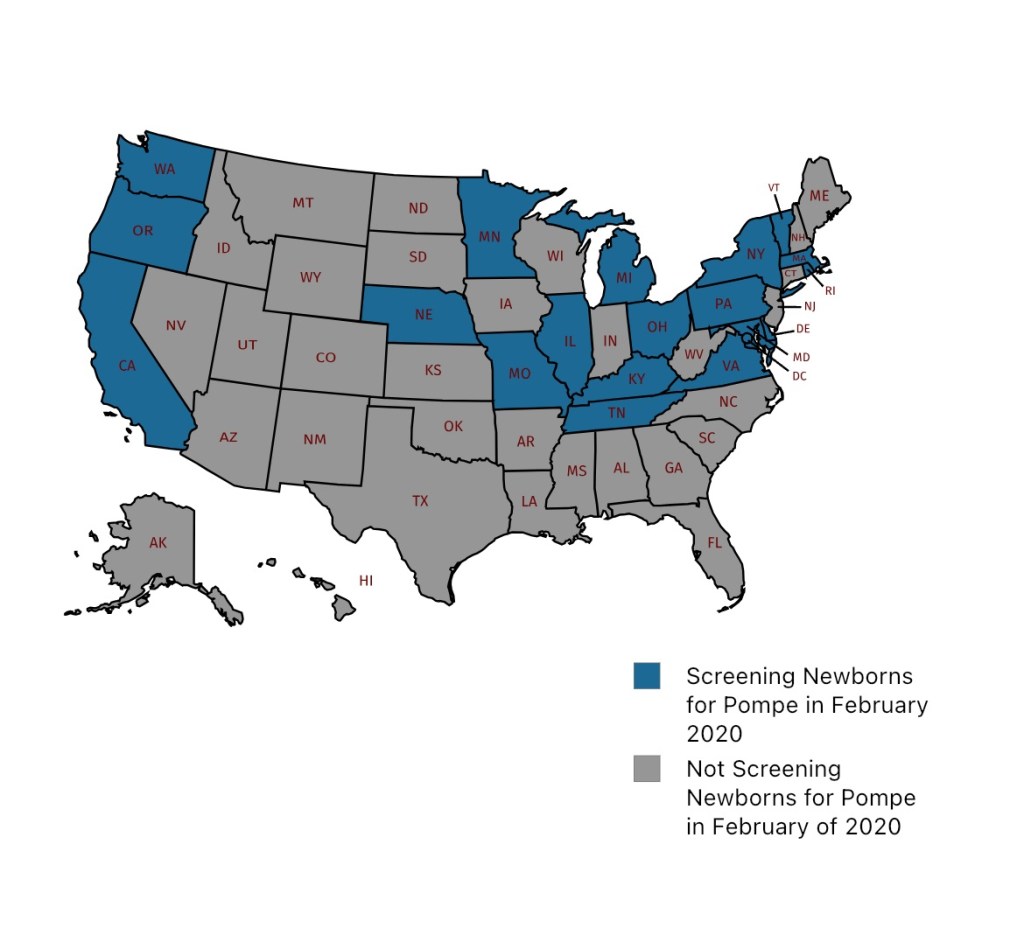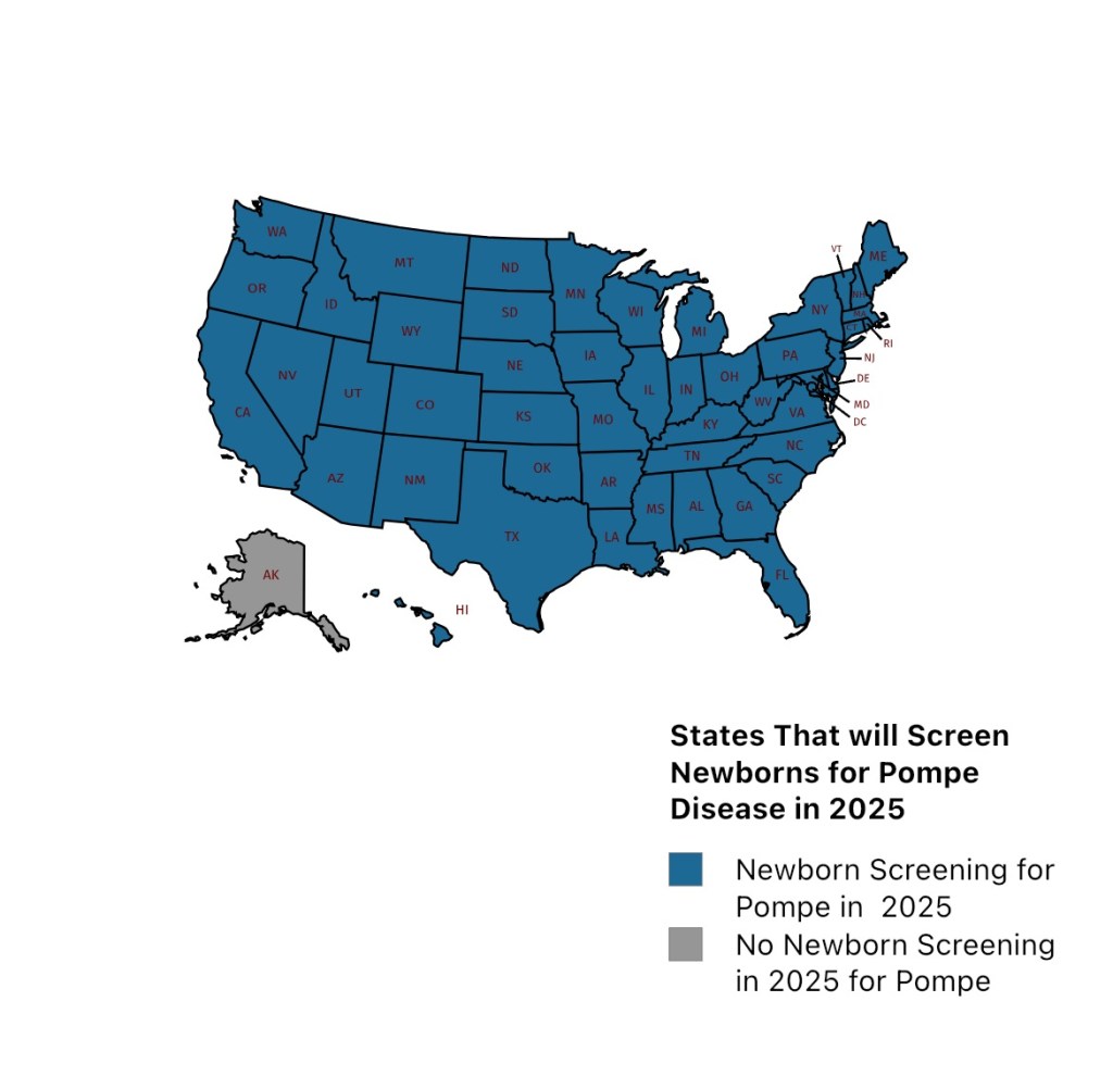 In February of 2020, only 20/50 states were screening newborns for Pompe Disease. Today, in 2025, 49/50 states will screen newborns in the US. Early intervention is drastically improving outcomes for children born with disease and this is all thanks to an increase in screening and early intervention. Because of this, Pompe Disease is no longer a death sentence.